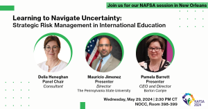 Delighted to be joining expert presenters Mauricio Jimenez (The Pennsylvania State University) and Delia Teresa Heneghan (Acumen) for the panel “Learning to Navigate Uncertainty: Strategic Risk Management in International Education” as part of the NAFSA 2024 Annual Conference & Expo in New Orleans.